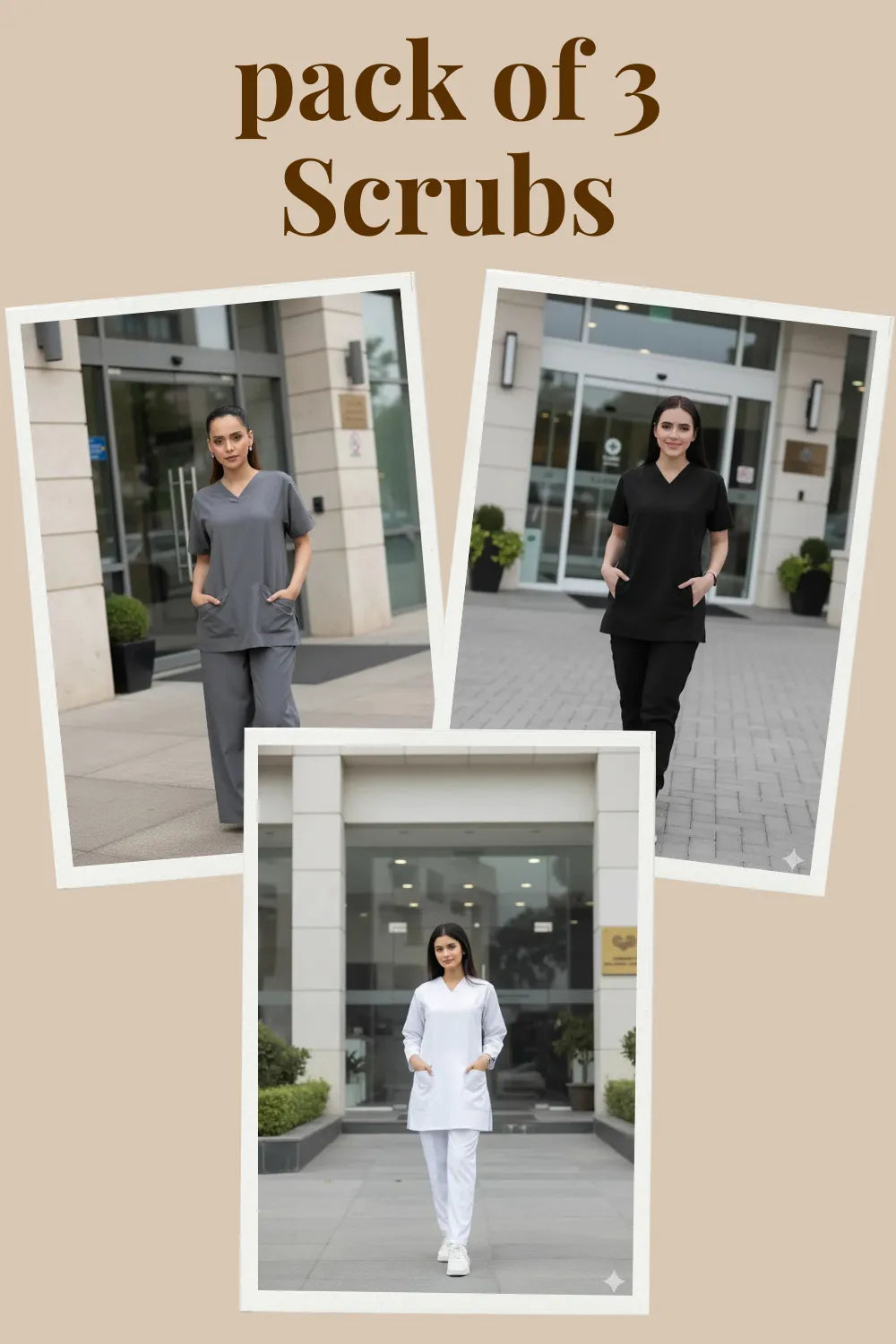 Includes Grey, Black, and White scrubs – a timeless and versatile combination
